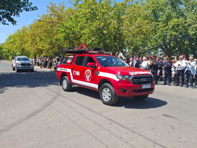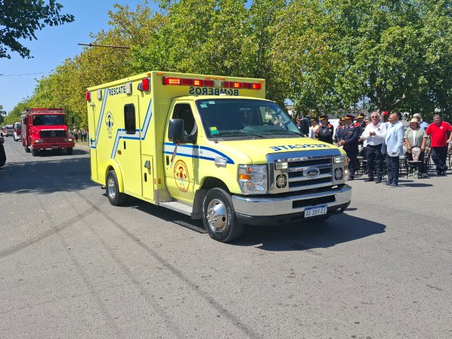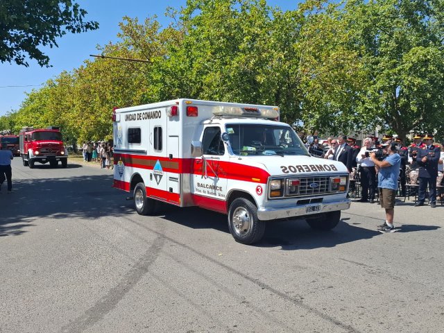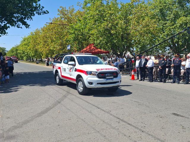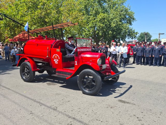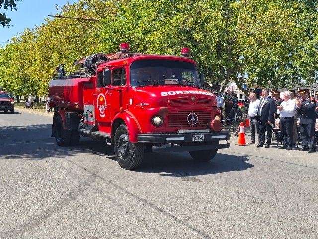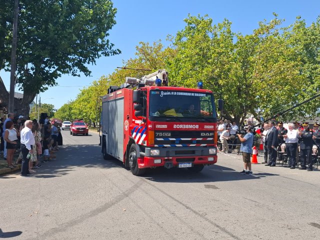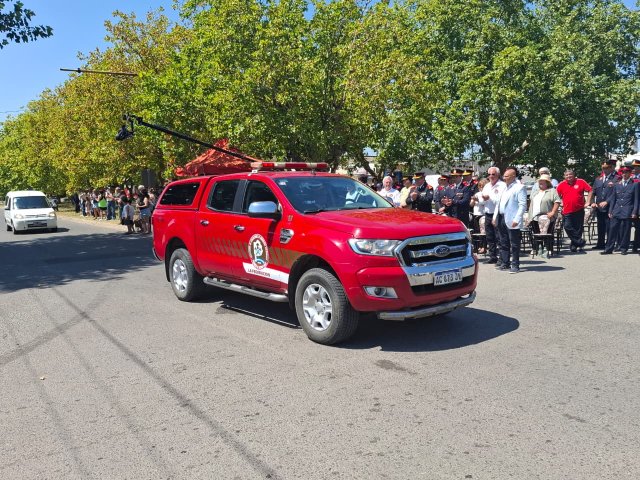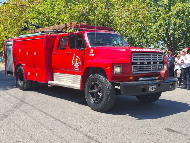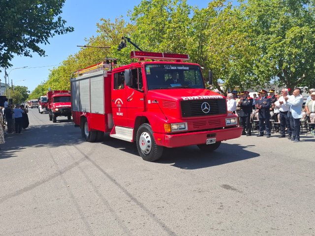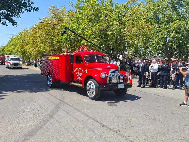 El desfile de unidades de los Bomberos Voluntarios se desarrolló sobre la avenida Del Valle, entre calles 2 y 4, y fue uno de los momentos centrales del acto por los 75 años de la institución. Del recorrido participaron todas las unidades operativas, a las que se sumó la Unidad N°2, recientemente restaurada tras un año de trabajos y presentada oficialmente para la ocasión, generando un fuerte acompañamiento del público presente.