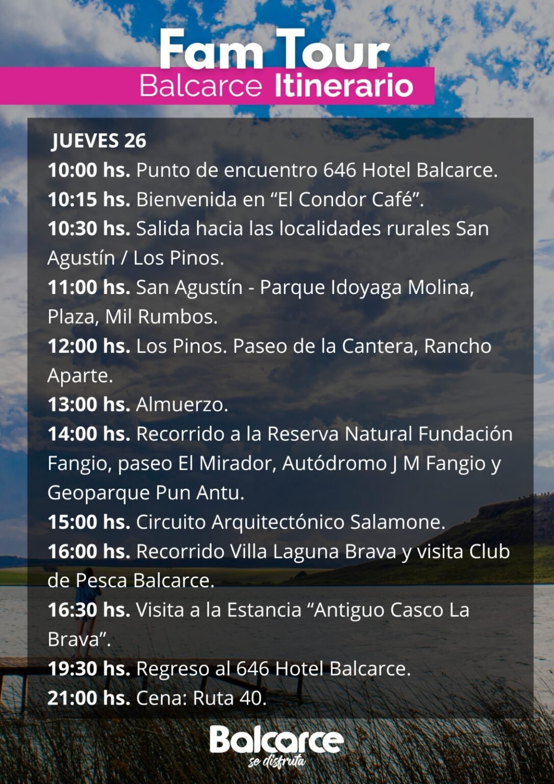 Durante las dos jornadas, los visitantes desarrollarán un itinerario que incluye circuitos por localidades rurales como San Agustín y Los Pinos, visitas a espacios emblemáticos como el Museo Juan Manuel Fangio y recorridos por entornos naturales destacados como la Laguna Brava y el Geoparque Pun Antü.