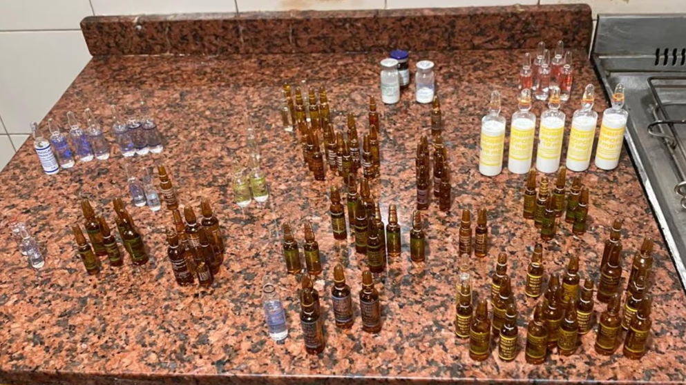 Durante el procedimiento, los efectivos secuestraron una jeringa, un guante de látex y una importante cantidad de medicamentos. Entre ellos, ampollas de propofol, fentanilo, lidocaína, dipirona, clonazepam, diazepam, adrenalina, haloperidol, entre otros fármacos de uso clínico. También incautaron tres teléfonos celulares.