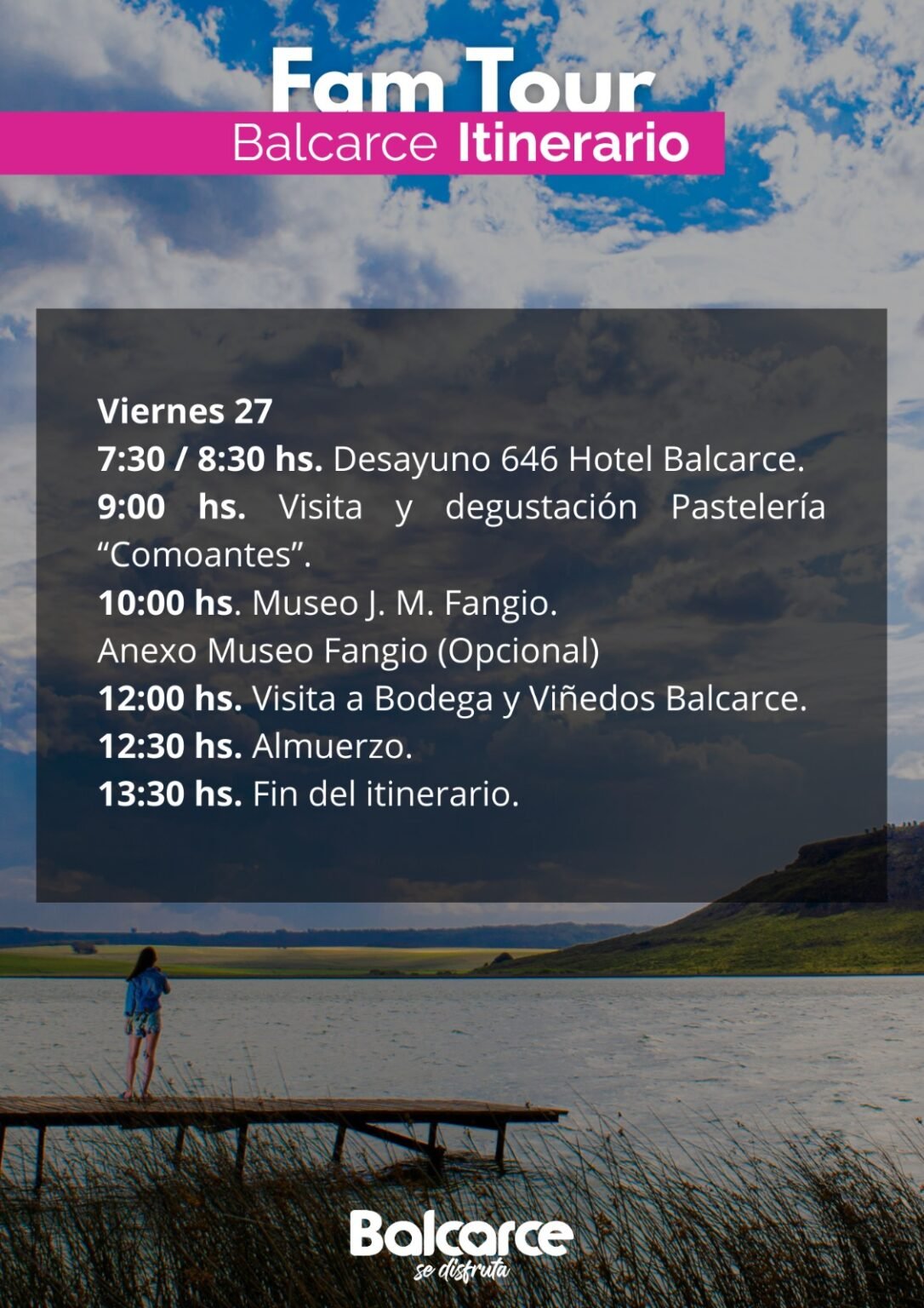 Durante las dos jornadas, los visitantes desarrollarán un itinerario que incluye circuitos por localidades rurales como San Agustín y Los Pinos, visitas a espacios emblemáticos como el Museo Juan Manuel Fangio y recorridos por entornos naturales destacados como la Laguna Brava y el Geoparque Pun Antü.