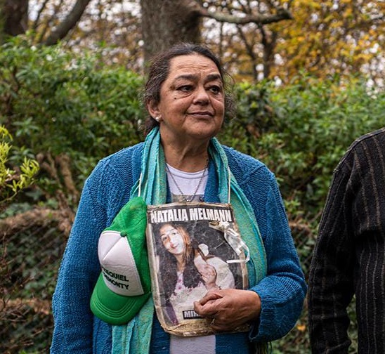 “Mi nombre es Laura Calampuca, soy la mamá de Natalia Melmann, asesinada el 4 de febrero del 2001”, comienza su testimonio. Y continúa: “Durante 24 años la lucha no bajó los brazos. Estamos muy agradecidos a los testigos que ayudaron a sentenciar a tres de los asesinos en el primer juicio”.