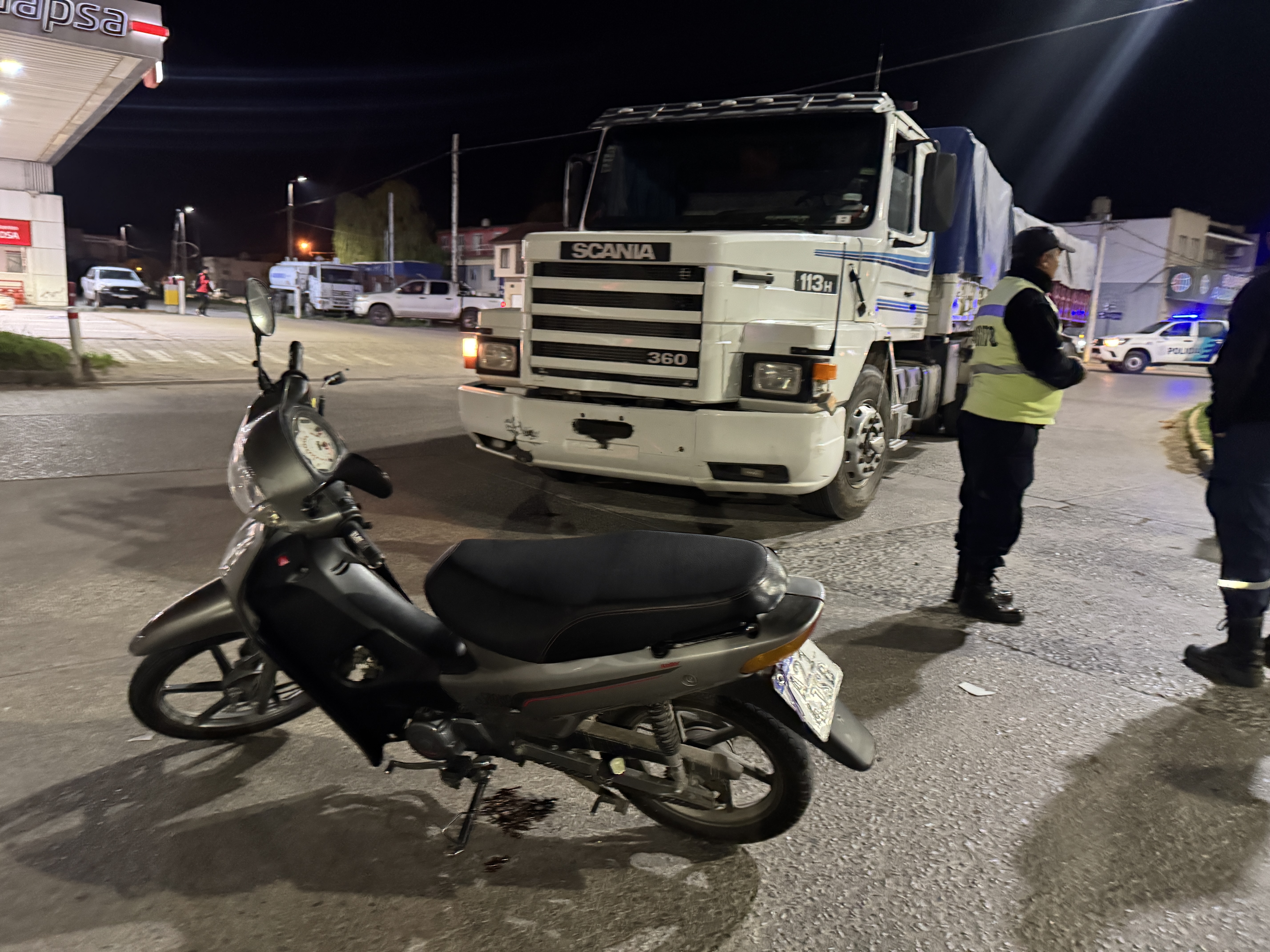 Una motociclista resultó herida en la noche de este jueves luego de ser embestida por un camión en la intersección de avenida Pueyrredón (39) y avenida Centenario.