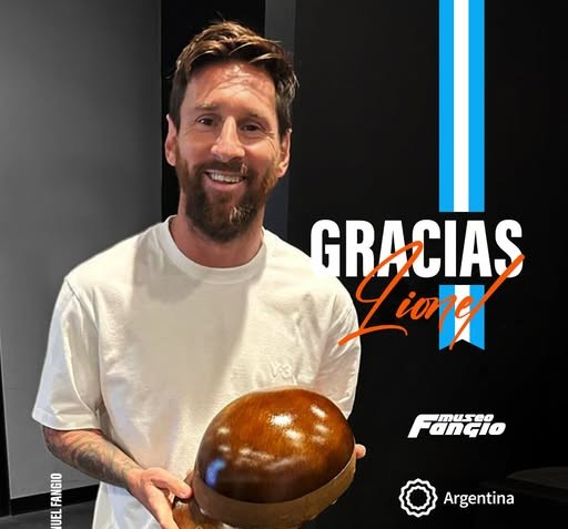 La Fundación Fangio le obsequió una réplica del casco de Juan Manuel Fangio a Lionel Messi, en reconocimiento a su trayectoria y los valores que los unen como íconos argentinos.
