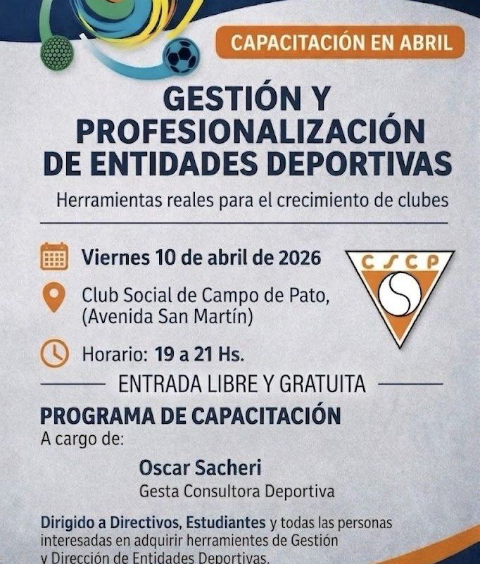 El Club Social y Campo de Pato llevará adelante una jornada de capacitación orientada a la Gestión y Dirección de Entidades Deportivas, destinada a directivos, estudiantes y público en general interesado en fortalecer sus conocimientos en el ámbito institucional.