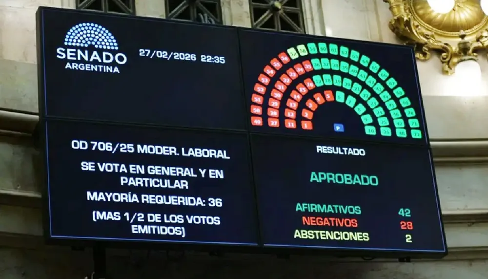 El Senado de la Nación convirtió en ley el proyecto de reforma laboral impulsado por el Gobierno nacional, tras obtener una mayoría de 42 votos afirmativos, 28 negativos y dos abstenciones, en una sesión que estuvo marcada por manifestaciones en las inmediaciones del Congreso.