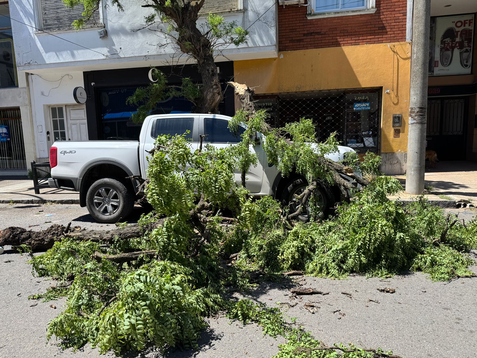 Según pudo saber GABAL, la camioneta había estado estacionada aproximadamente una hora cuando la pesada rama se desprendió y golpeó de lleno el parabrisas y parte del techo, generando importantes daños materiales.